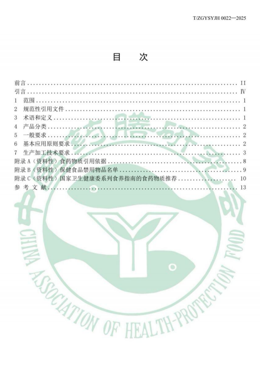 原料合规性:严格限定食药物质使用范围,明确引用依据,严禁超范 围使用保健食品禁用物品,从源头把控产品安全; 生产工艺规范:明确生产加工技术要求,规范原料处理、炮制、加工、 灭菌、包装等全流程操作,保障产品质量稳定性; 应用原则明确:确立 “辨证施食、药食同源、安全优先” 的基本应 用原则,确保产品符合中医药理论与现代食品安全要求。