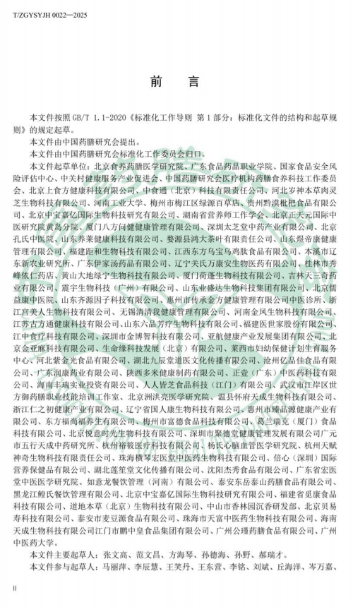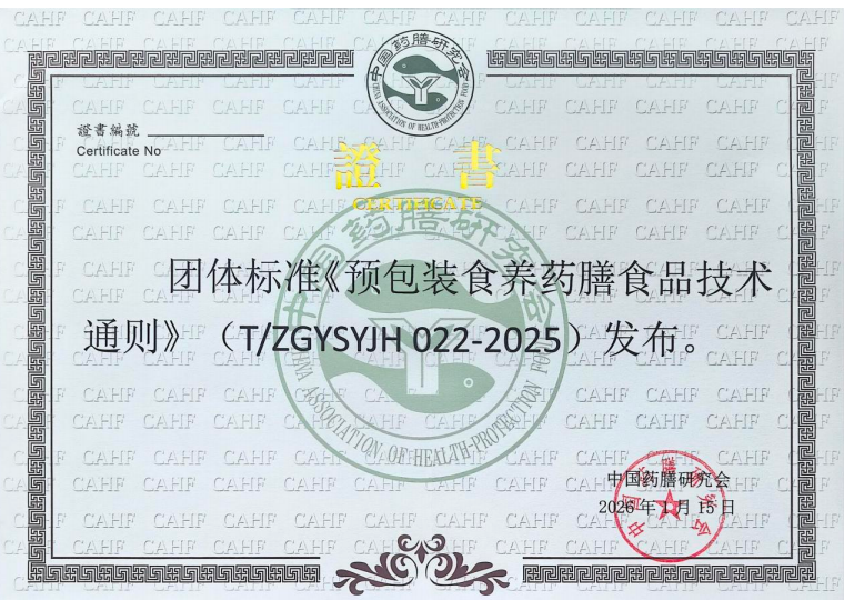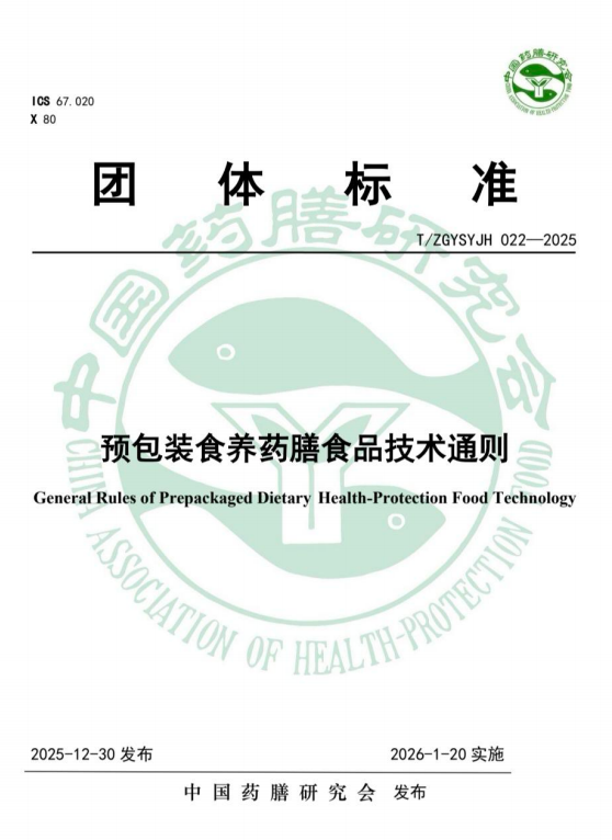 2026 年 1 月 5 日,由中国药膳研究会正式发布,北京食养药 膳医学研究院牵头,联合广东食品药品职业学院、国家食品安全风险 评估中心、中关村健康服务产业促进会、中国药膳研究会医疗机构药 膳食养科技工作委员会等百余家单位共同起草的国内首部预包装食 养药膳食品领域专项团体标准《预包装食养药膳食品技术通则》 (T/ZGYSYJH 022-2025) 正式实施,为行业发展立下 “定盘星”, 为产业升级筑牢 “压舱石”。